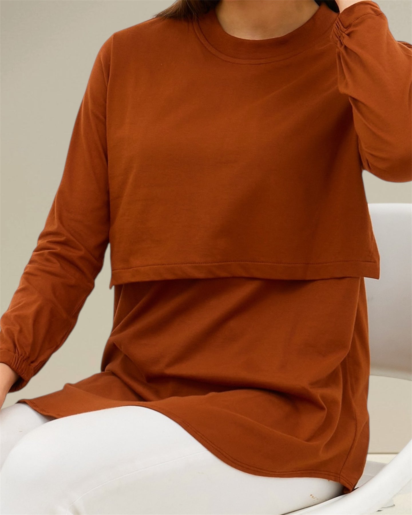 This long sleeve nursing top features a relaxed and modest fit, providing full coverage while maintaining a contemporary and elegant look. The warm cinnamon colour adds a rich, earthy tone to your wardrobe, making it a standout piece for casual or semi-formal settings. The natural texture of slub cotton enhances its aesthetic appeal, offering a unique and comfortable addition to your maternity and postpartum clothing.